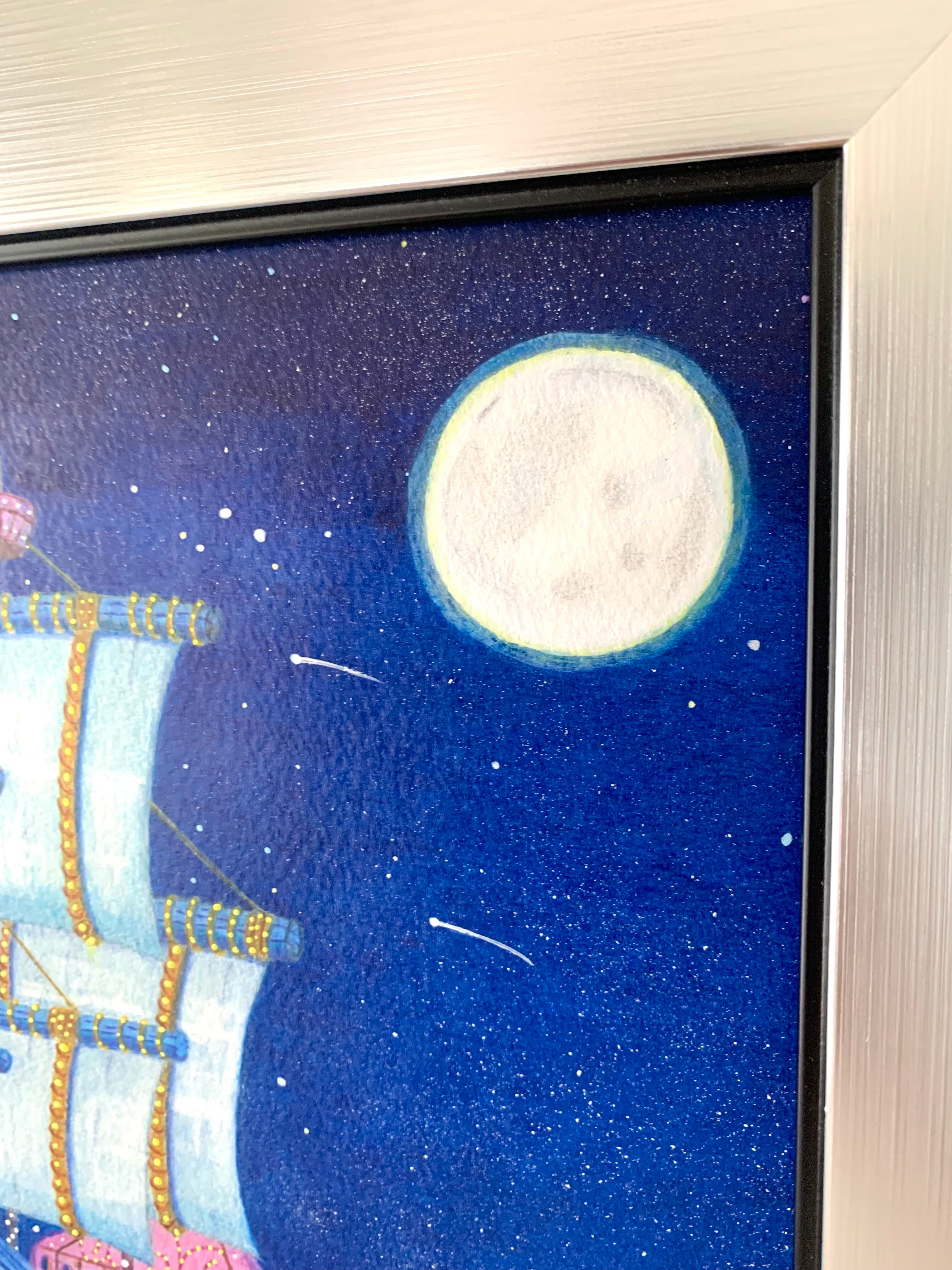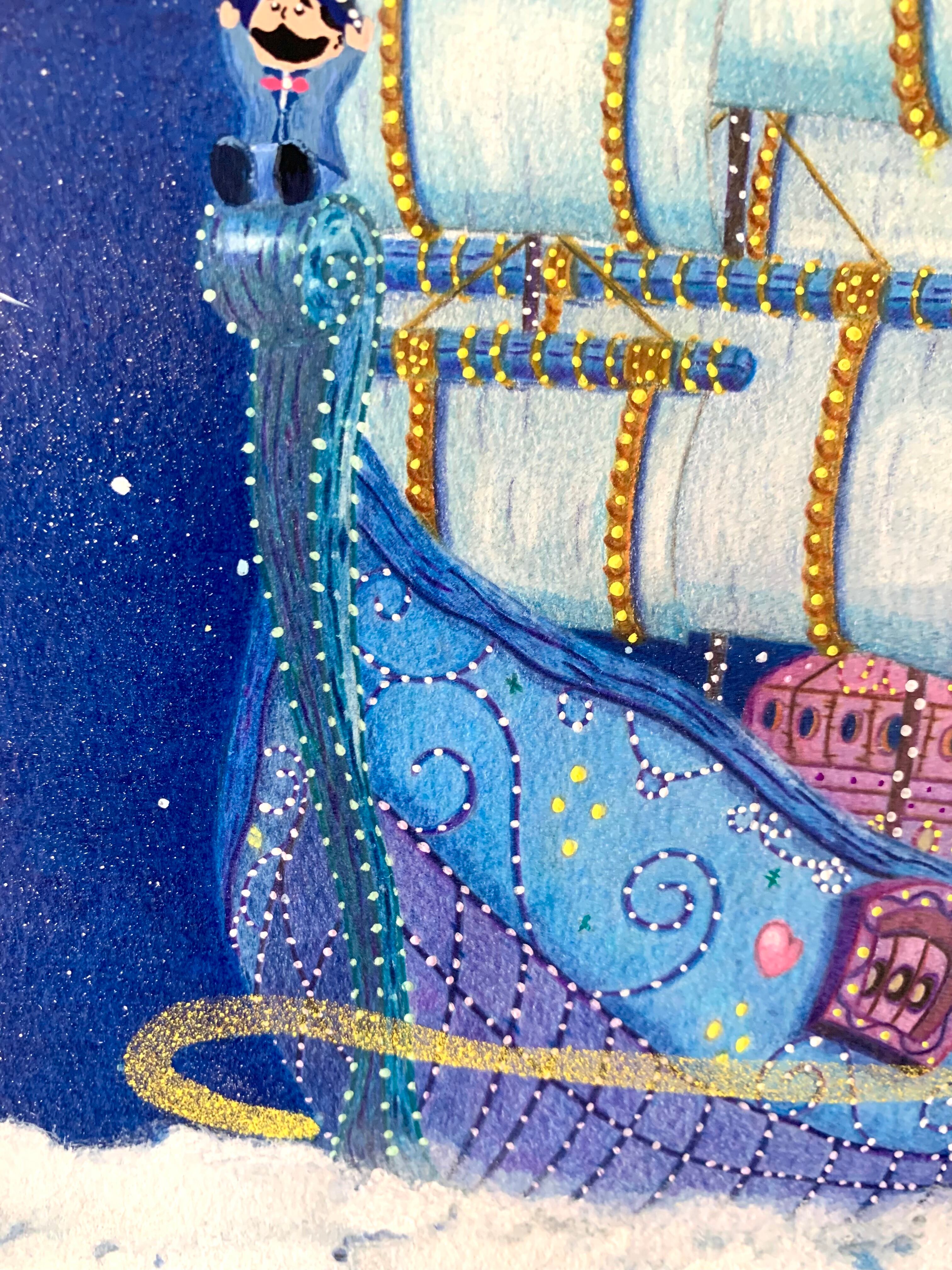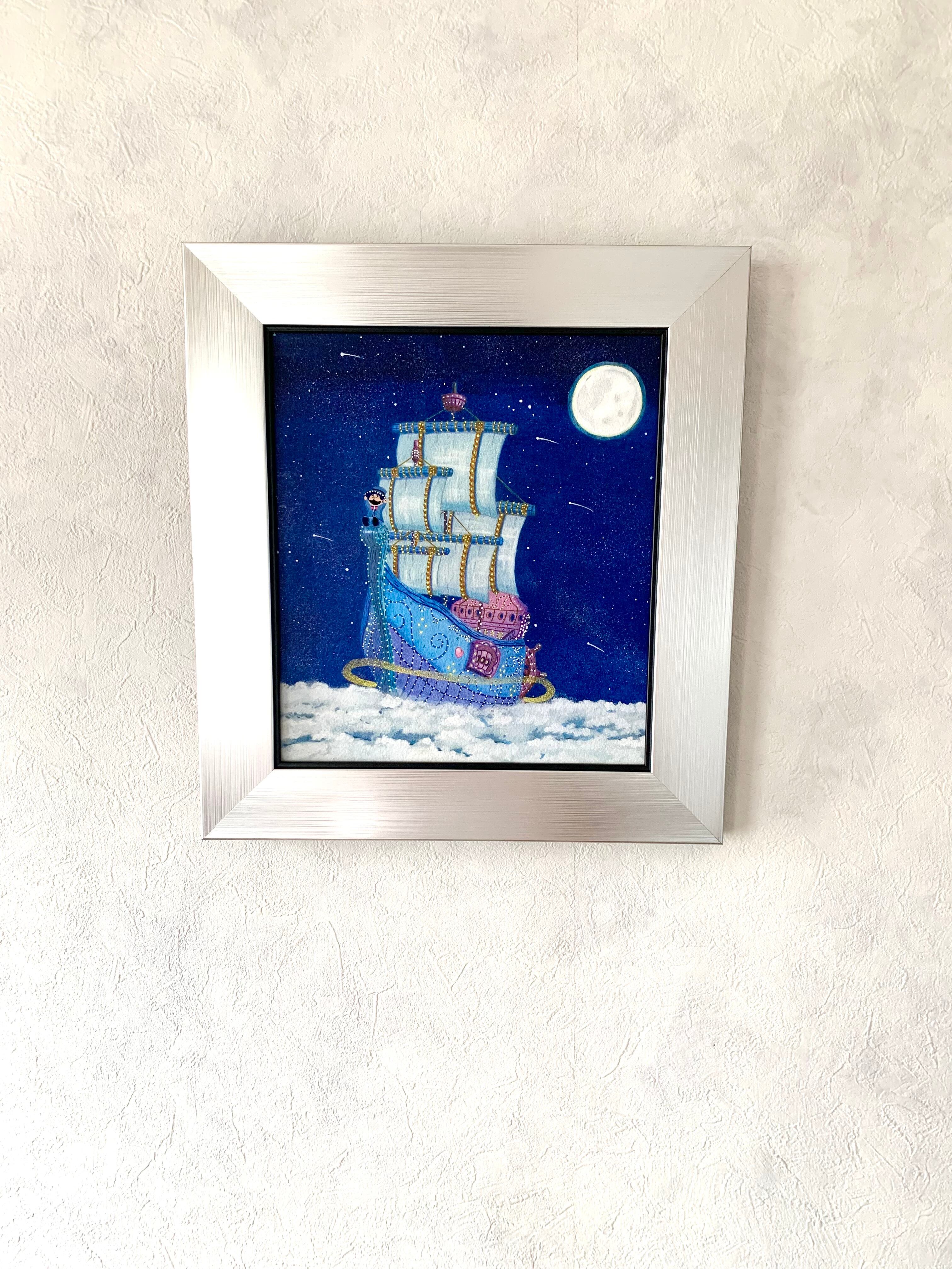 色鉛筆のマットな表情とアクリル絵の具が発色のアクセントになっていて近くで見るとより一層色の鮮やかさと、細かい表情が見れて、