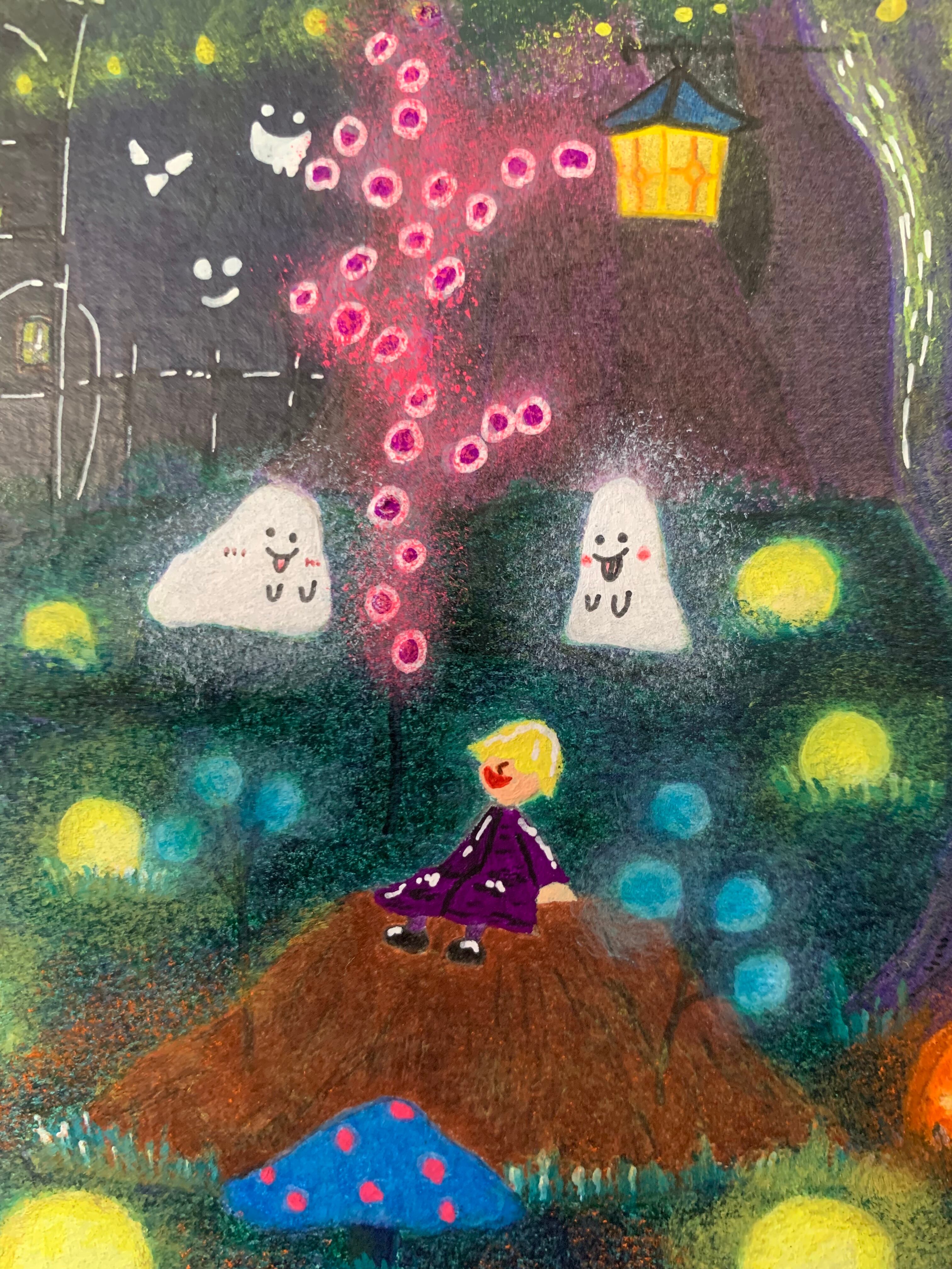 作品のほとんどをアクリル絵の具を使い、仕上げに足りないところを色鉛筆で補うという方法で制作しております。